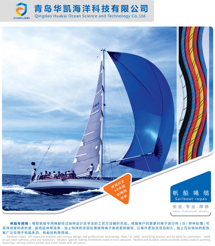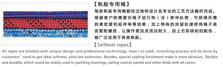 帆船專(zhuān)用繩:每款帆船用繩都經(jīng)過(guò)獨(dú)特設(shè)計(jì)及專(zhuān)業(yè)的工藝方法編織而成,根據(jù)客戶(hù)的需要對(duì)繩子進(jìn)行冷(熱)牽伸處理,可獲得所需的柔軟度和延伸率的效果;加上特殊的涂層處理使得繩子表面更耐磨損,讓操作更加靈活且耐久,加上五彩繽紛的配色,被廣泛應(yīng)用于各類(lèi)帆船。